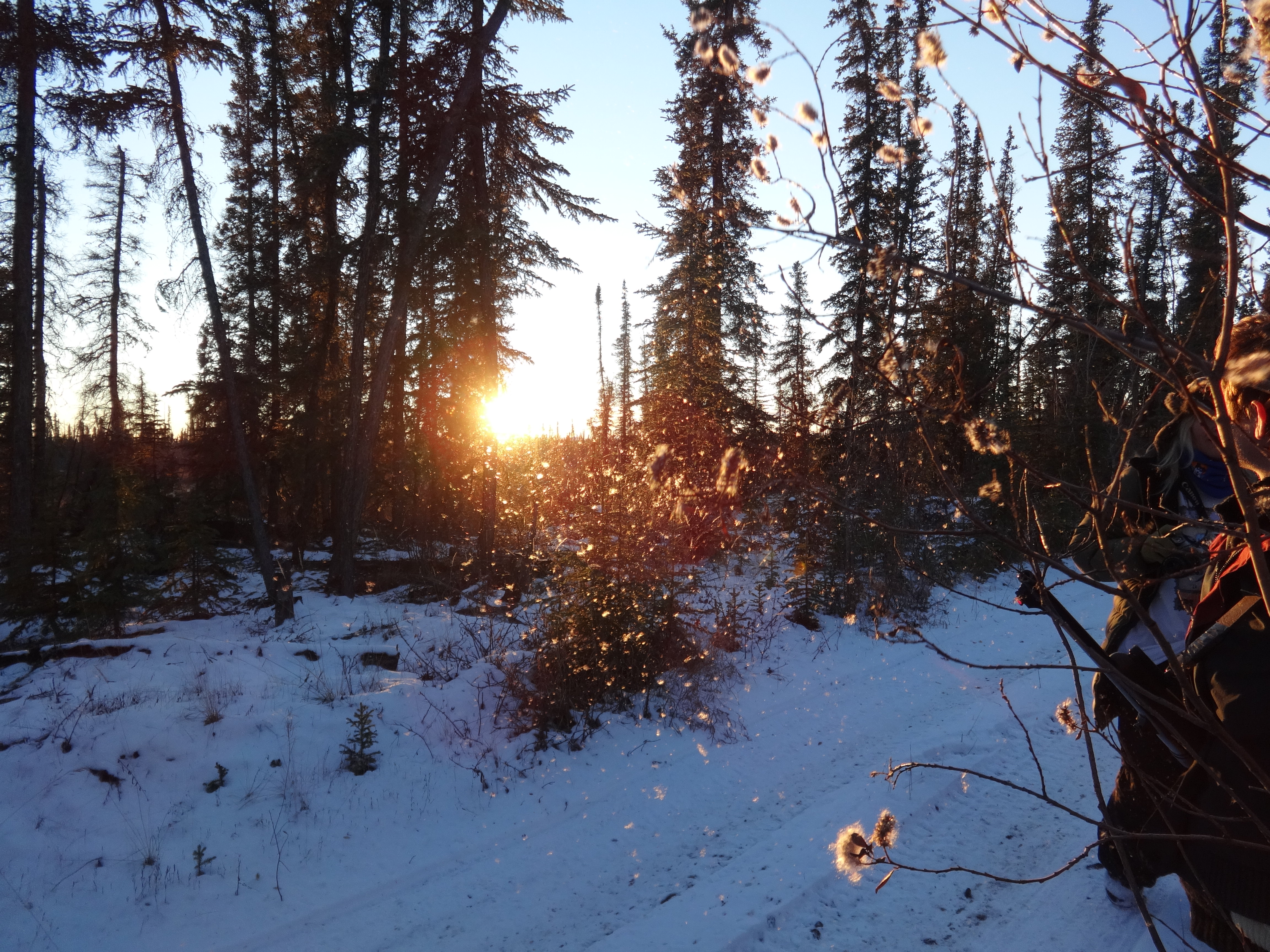 The three of us walked a while beyond the gravel bar before we lit our fire. I wanted to hike to someplace new, and the weather was perfect: forty at least, with day-old snow on the ground and blue skies and sun.